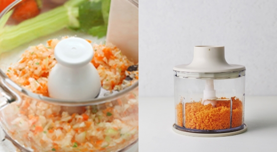野菜のみじん切りや肉のミンチなど下ごしらえ向きのキッチン家電です。包丁やおろし金の変わりと言ってもいいでしょう。ミキサーやハンドブレンダーのように、滑らかな液体状に攪拌することは期待できず、「切る」ことに特化しています。