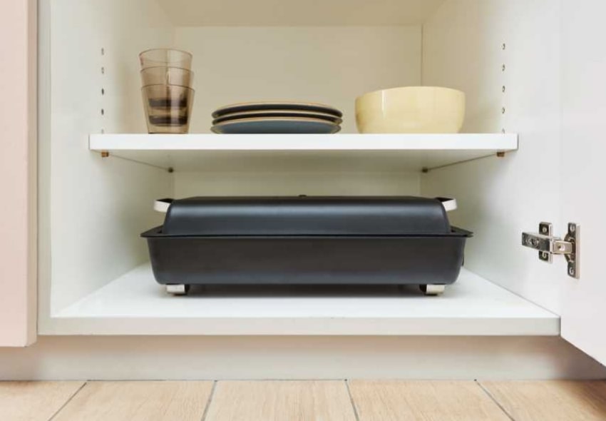 4~5人分の料理をまとめて作れる大容量ながら、収納しやすい薄型形状。使いたいときにパッと出せて、使用後はさっと収納できます。