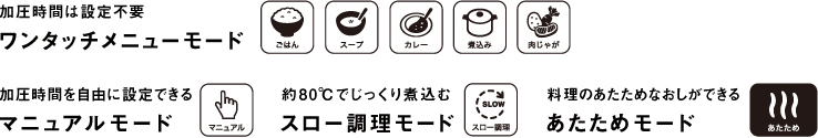 加圧時間を1分単位で設定できる「マニュアルモード」、じっくり煮込んで味が染み込む「スロー調整モード」など、これ一台で幅広い料理レパートリーをお楽しみいただけます。