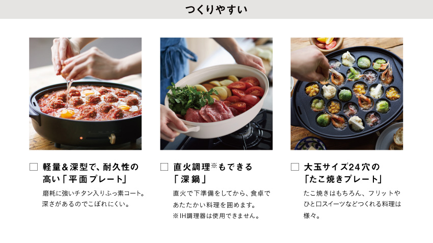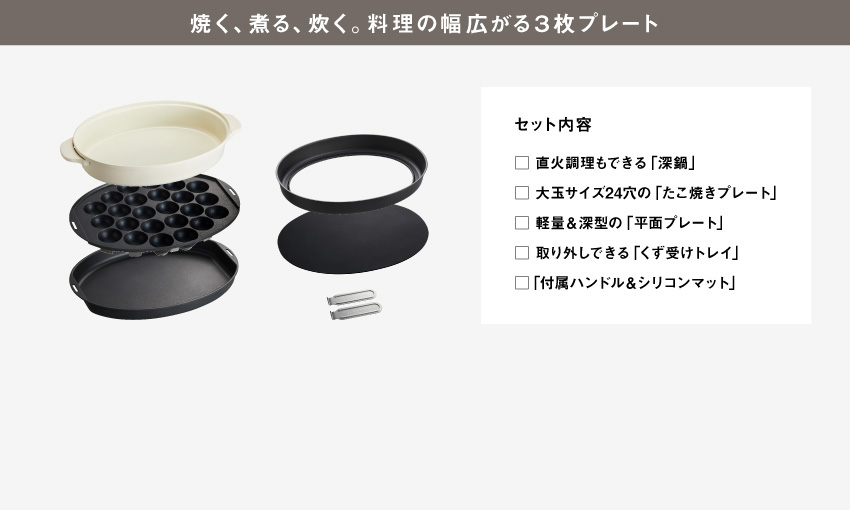「コンパクトホットプレート」や「ホットプレートグランデサイズ」付属の平面プレートに比べ深めの仕様なので吹きこぼれの心配がなく炊飯も可能に。 さらに人気のたこ焼きプレートと、煮込み料理や鍋物などもお楽しみいただける深鍋のプレート3種をセット。これ一台で、毎日幅広い料理をお愉しみいただけます。