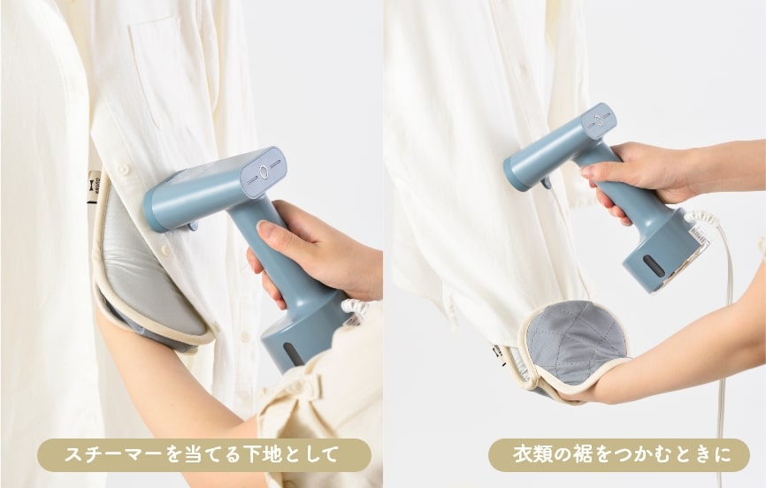 つかみ&プレスの2WAY仕様で、左右どちらの手でも装着可能。裾や袖口の仕上げ、ボタンまわりや襟元など、細かい部分の衣類ケアにつかえるお役立ちアイテムです。