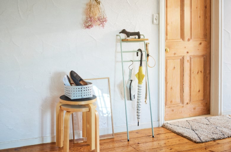 スリムなラックは廊下や玄関など限られたスペースにこそぴったり。天板はイヤホンやキーケースなどの小物置き場に、下のバーは長傘やレインコートを掛けて、サイドのフックにはエコバックやペット用リードなど。外出時に必要なアイテムがコンパクトに整頓できます。