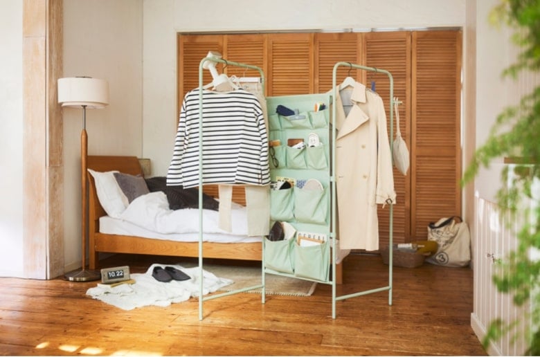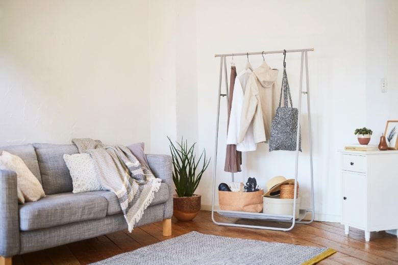 リビングでも寝室でもインテリアになじむ、スリムなハンガーラック。クローゼットだけでは収納が足りない部屋の”ちょい足し収納”におすすめ。