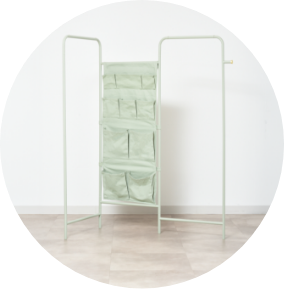 Z型・L型など空間をお好みで仕切ることができる収納付きパネルラック。リビング続きの寝室など、ちょっとしたスペースを分けたいときにぴったり。ハンギングポケットには小物をたっぷり収納できるのも使い勝手のいいポイントです。