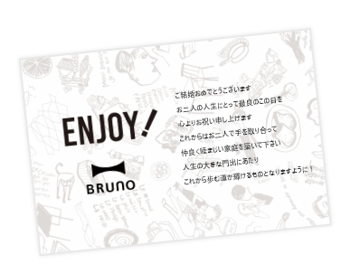 結婚祝いのギフトと一緒に、メッセージカードで気持ちを伝えてみませんか? BRUNO onlineでは、オリジナルデザインのメッセージカードを多数ご用意しております。 無料で作成して商品と一緒にお届けすることができますので、ぜひ合わせてご利用ください。