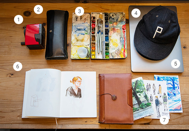1_軽さとサイズが持ち運びに便利な鉛筆削り。2_〈POSTALCO〉のペンケースには定規、色鉛筆、ペンを入れて。使うほどにいい味が出て愛着が湧く。3_屋外スケッチに重宝するコンパクトな水彩パレット。4_中目黒にあるショップで購入した〈PHIGVEL〉のキャップ。日差しが強い日には欠かせない。5_ラップトップはタッチバー搭載のMacを愛用。ソフトはPhotoshopとIllustratorを使う。6_スケッチブックには〈Midori〉の「MDノート」を。コットン紙は鉛筆との相性抜群! 7_ハガキに描くことも多いので、ポストカードホルダーは必需品。