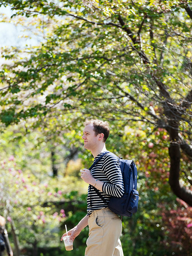 「ちょっと出かけるのに必要なものはなんでも入る申し分のないサイズ。シンプルなデザインも好みですね」と、バックパックからスケッチブックを取り出す。お気に入りのコーヒースタンドで、コーヒー片手に通りすがる人たちを描いてウォーミングアップ。