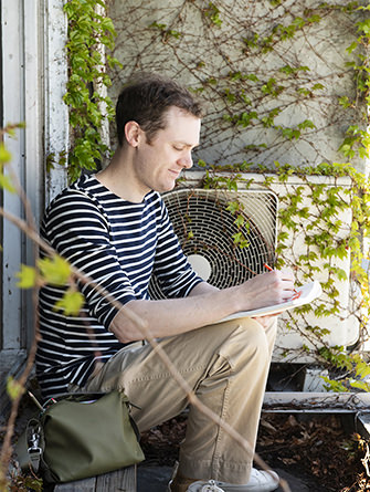 エイドリアンさんはいつもスケッチブックと一緒。新緑の街を歩き、気ままに描く。