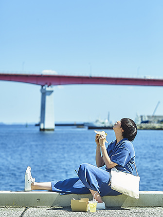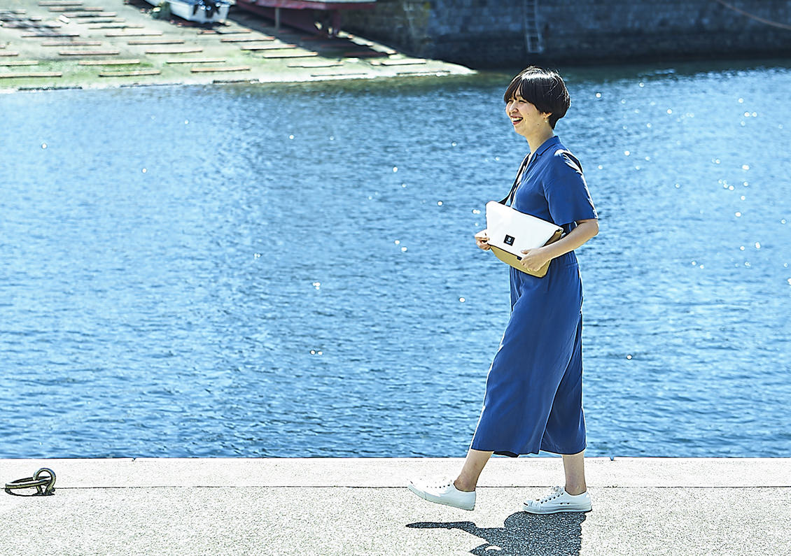 「アタシ社」から徒歩3分の漁港へ向かい、散歩とともに三根さんの一日は始まる。今日は、キラキラと光る水面が本当にきれい。「ホワイトが素敵ですね」と、三根さんが選んだボディバッグは体にフィットして、持っているのも忘れちゃうほど足取りも軽快!