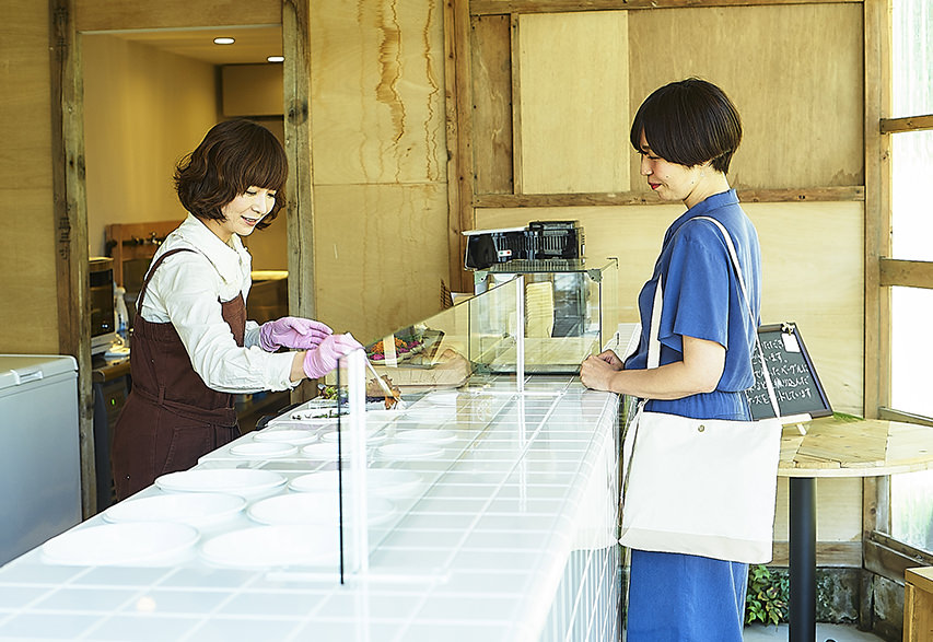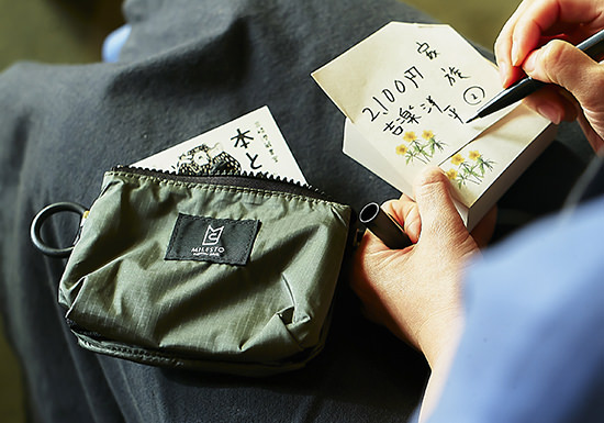 「メモや細々したものを入れるのに使いやすい!」と、三根さんお気に入りはポーチ。「これでスマホをどこに置いたか忘れない(笑)」と、シンゴさんはサコッシュ派。「そろそろ地元の子どもたちが遊びにくる時間だね」と、笑顔で仲良く店番の二人。