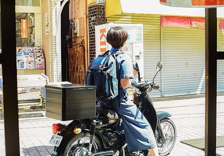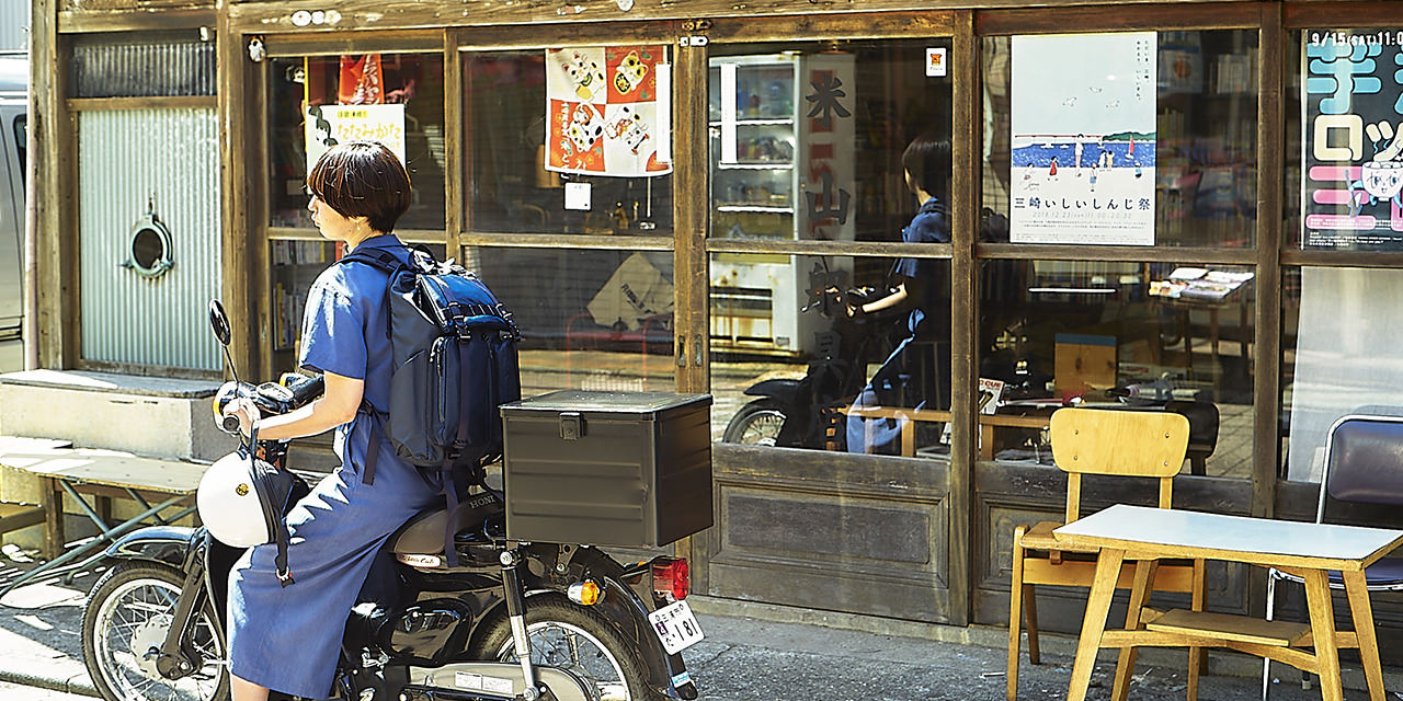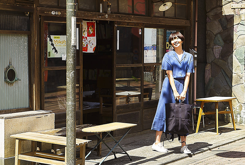「打ち合わせに出かけま〜す」。海と空が一体となった見晴らしがいい橋を、愛車のカブで渡るのがいつも楽しみなんだとか。「ラップトップ、本、資料……と荷物が重い!」と、仕事にはバックパックが基本。同系色のコーディネートがいい感じ♪