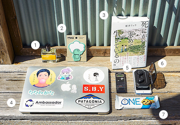 1_フレグランスのマニアで、〈BON PARFUMEUR〉のメロンの香りがお気に入り。2_忘れないようにメモ書きして貼る付箋は必需品。3_書評や書籍の紹介文の依頼も多く、いつもバッグには本を1冊。4_ラップトップには好きなステッカーをペタペタと貼って楽しむ。「アタシ社」プロデュースのものも。5_取材時にはボイスレコーダーが必須。iPhoneのボイスメモ機能とダブル使いすることがほとんど。6_日課となっているランニングや移動中は、iPodとワイヤレスのイヤホンで音楽を聴く。7_プロテインバーは小腹が空いた時に。売っているのを見つけたら買い溜め!