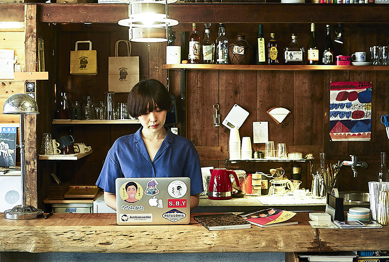 事務所の1階にある蔵書室「本と屯」で、編集者の夫シンゴさんと二人で店番を。