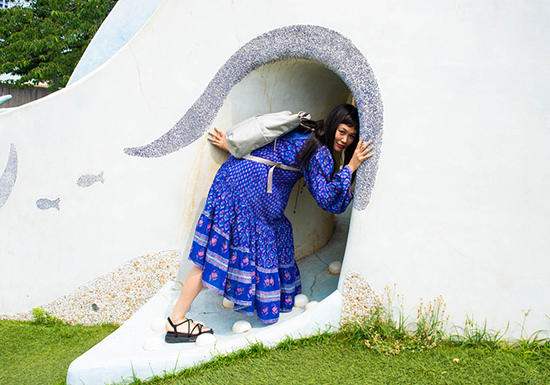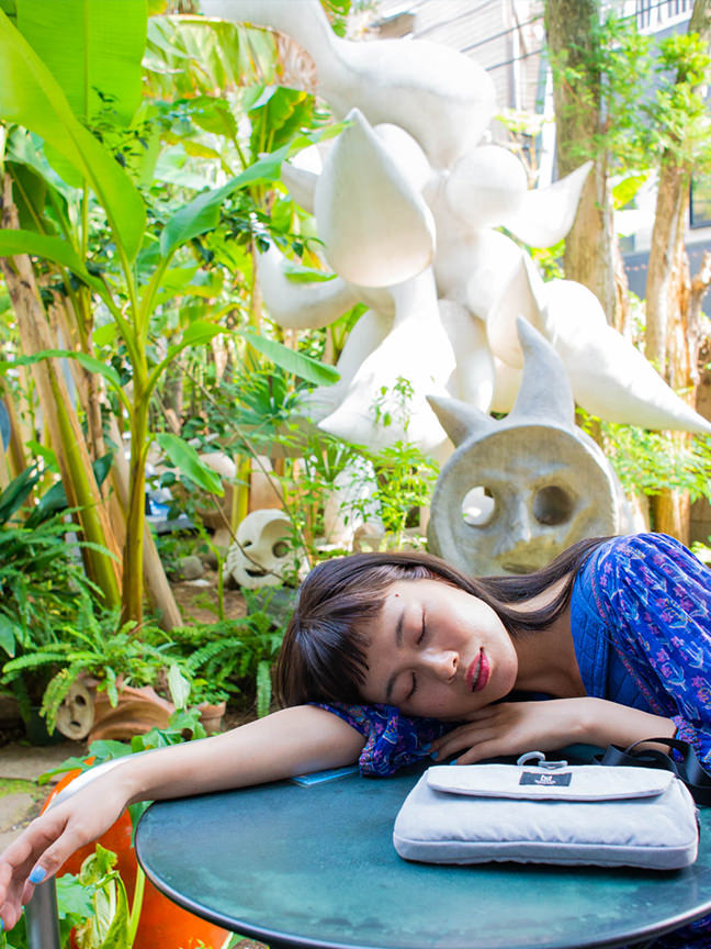 「庭のアート作品を眺めながらお茶ができるなんて贅沢!」。貴重品をひとまとめにできる便利なマルチショルダーでスマートに、〈岡本太郎記念館〉に隣接するカフェのテラス席でのひととき。「バッグがあるのを忘れちゃうところだった(笑)。身軽っていいなぁ」