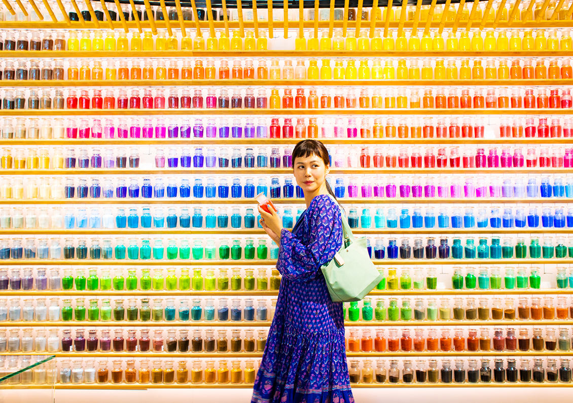 顔料、和紙、筆などの伝統画材がところ狭しと並んだ、お気に入りのショップへ。「まるで実験室みたいで何時間でも過ごせちゃう」と目を輝かせるシェンさん。ペールグリーンのカラーが気分を上げてくれるトートは、今の気分にぴったりみたい。