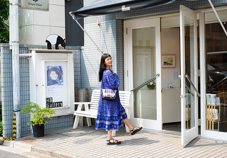 「すごく落ち着く空間なんですよ」と足を踏み入れたのは、街の一角にある小さなギャラリー。「大きめのカメラを入れたりできる丈夫さもいい感じ」と、チェックのパターンが目を引くメッセンジャーで、コーディネートにもちょっぴり気分を添えて。