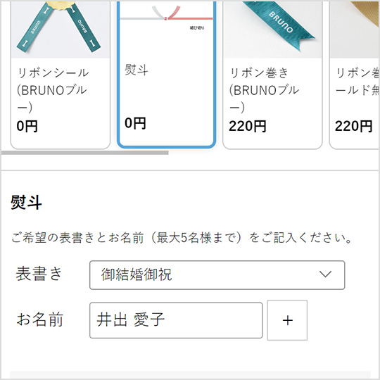 ご希望の表書き・お名前は「熨斗」欄へご記入ください。(最大で5名まで連名での記載が可能です)