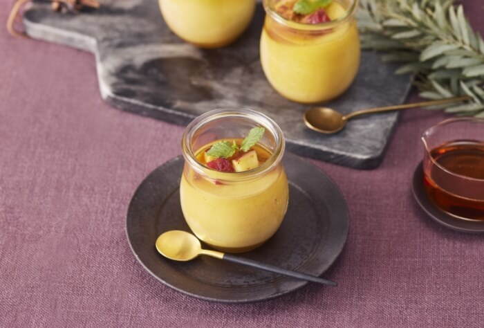 - ①にグラニュー糖、牛乳(50ml)、シナモンを加え、ブレンダースティックで撹拌する。ゼラチンを加えてさらに撹拌し、牛乳(150ml)を加えて軽く混ぜる。